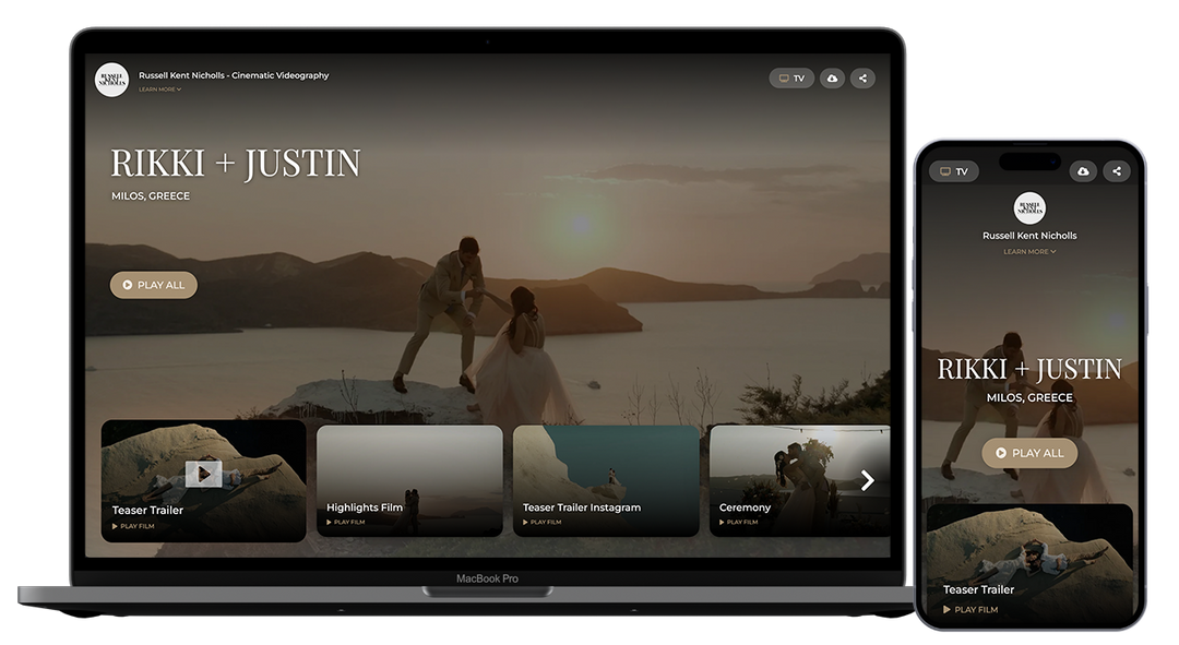 Your wedding photos are delivered in a beautifully designed private online gallery, perfect for viewing on your smart TV, tablet, or smartphone. You can browse, download, and share your favourite images effortlessly—and for your video, you’ll be able to watch your films all in one place. It’s everything you love about your day, ready to relive anytime, anywhere.